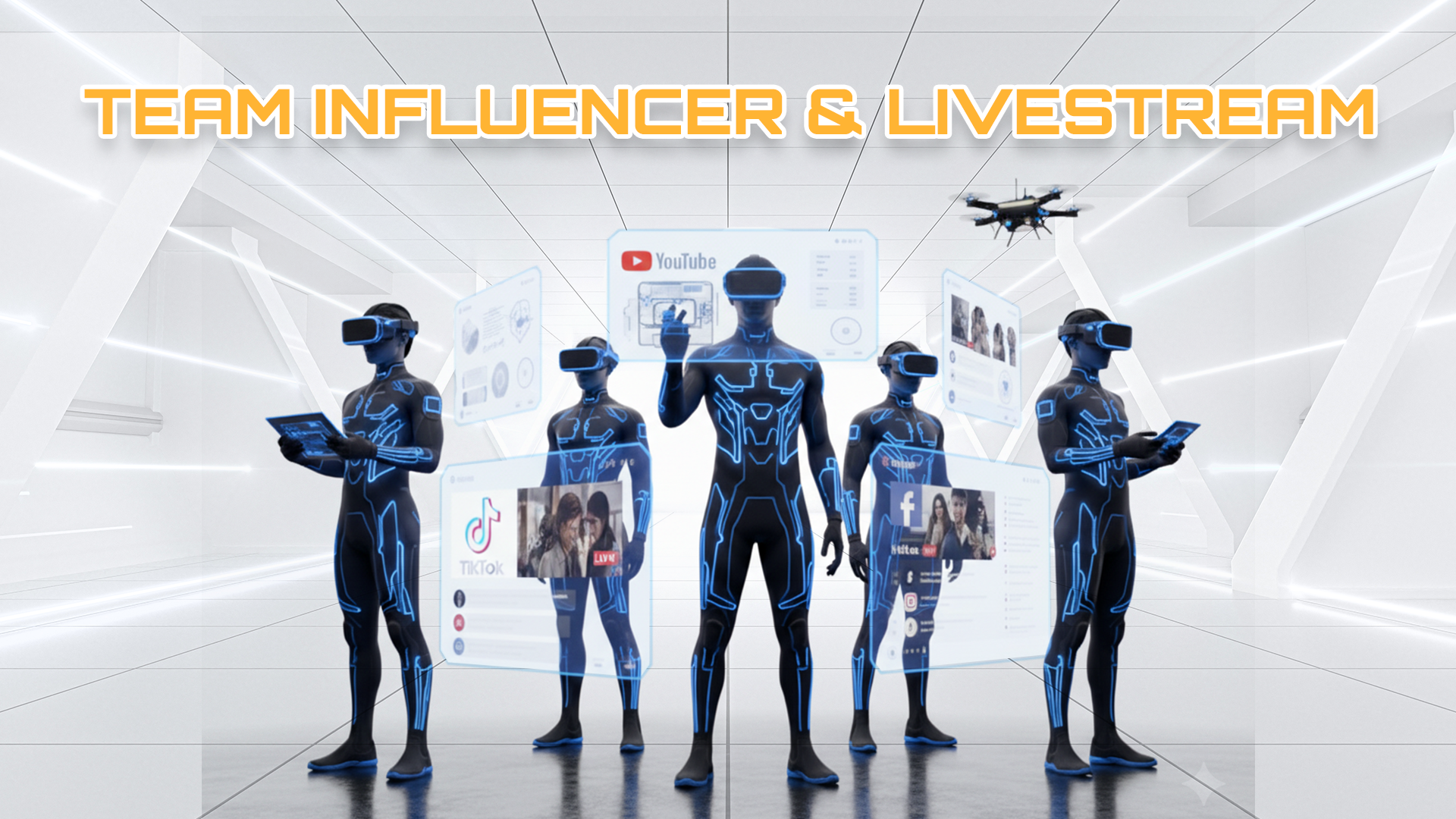 Team Influencer & Livestream đảm nhận việc kết nối thương hiệu với KOL/KOC, triển khai các chiến dịch hợp tác chiến lược. Đồng thời, team chuyên setup livestream và mega live nhằm gia tăng doanh số thương mại điện tử. Đây là cầu nối giúp thương hiệu lan tỏa mạnh mẽ và tạo tương tác trực tiếp với khách hàng.