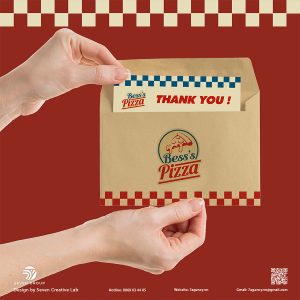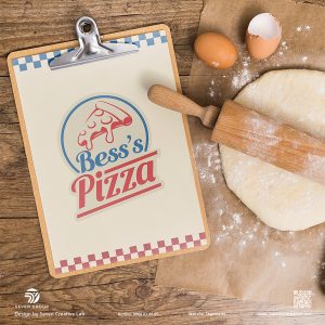 - Font chữ: Tên “Bess’s Pizza” được đặt trong một font chữ serif đậm, mang tính cổ điển, được sắp xếp theo hình vòng cung, củng cố tính hoài niệm.