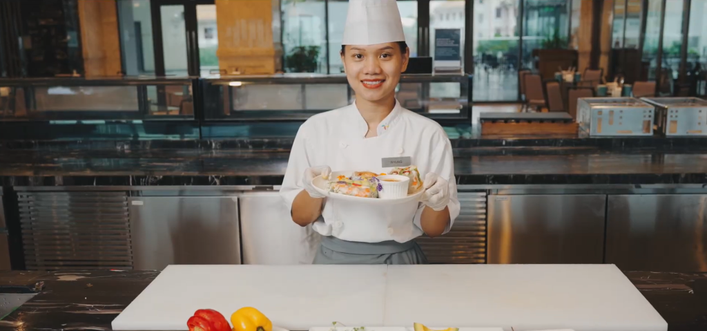 - Làm nổi bật nhân vật: quay cận cảnh vào gương mặt cô đầu bếp (nụ cười, ánh mắt tập trung) và bàn tay đang thao tác để cá nhân hóa câu chuyện và khẳng định sự tỉ mỉ, chuyên nghiệp.