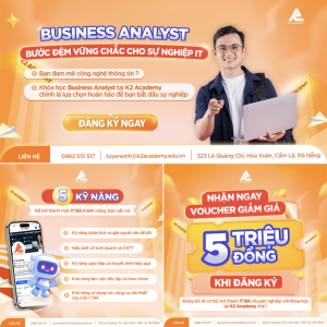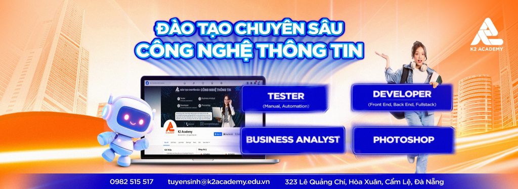 K2 Academy là một học viện chuyên đào tạo chuyên sâu về công nghệ thông tin, bao gồm các lĩnh vực trọng điểm như Developer, Tester , Business Analyst, Digital Marketing , và UX/UI. Với phương châm mang lại giá trị tốt nhất cho học viên, K2 Academy không ngừng phát triển, chia sẻ kiến thức, chấp nhận thay đổi và đột phá, đảm bảo học viên tiếp cận công nghệ mới nhất và có cơ hội việc làm ngay sau khi tốt nghiệp. Học viện được phát triển bởi những người có nhiều năm kinh nghiệm trong ngành phần mềm.