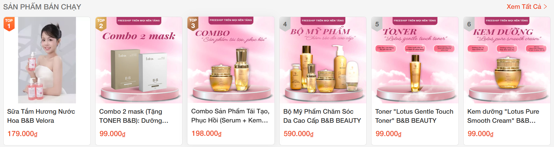 Shopee là kênh bán hàng trọng điểm của B&B BEAUTY, vì vậy Seven Group tập trung thiết kế hệ thống frame nhận diện dành riêng cho gian hàng và hình ảnh sản phẩm. Các frame được xây dựng đồng bộ với bộ nhận diện tổng thể, giúp sản phẩm nổi bật hơn trong môi trường cạnh tranh cao.